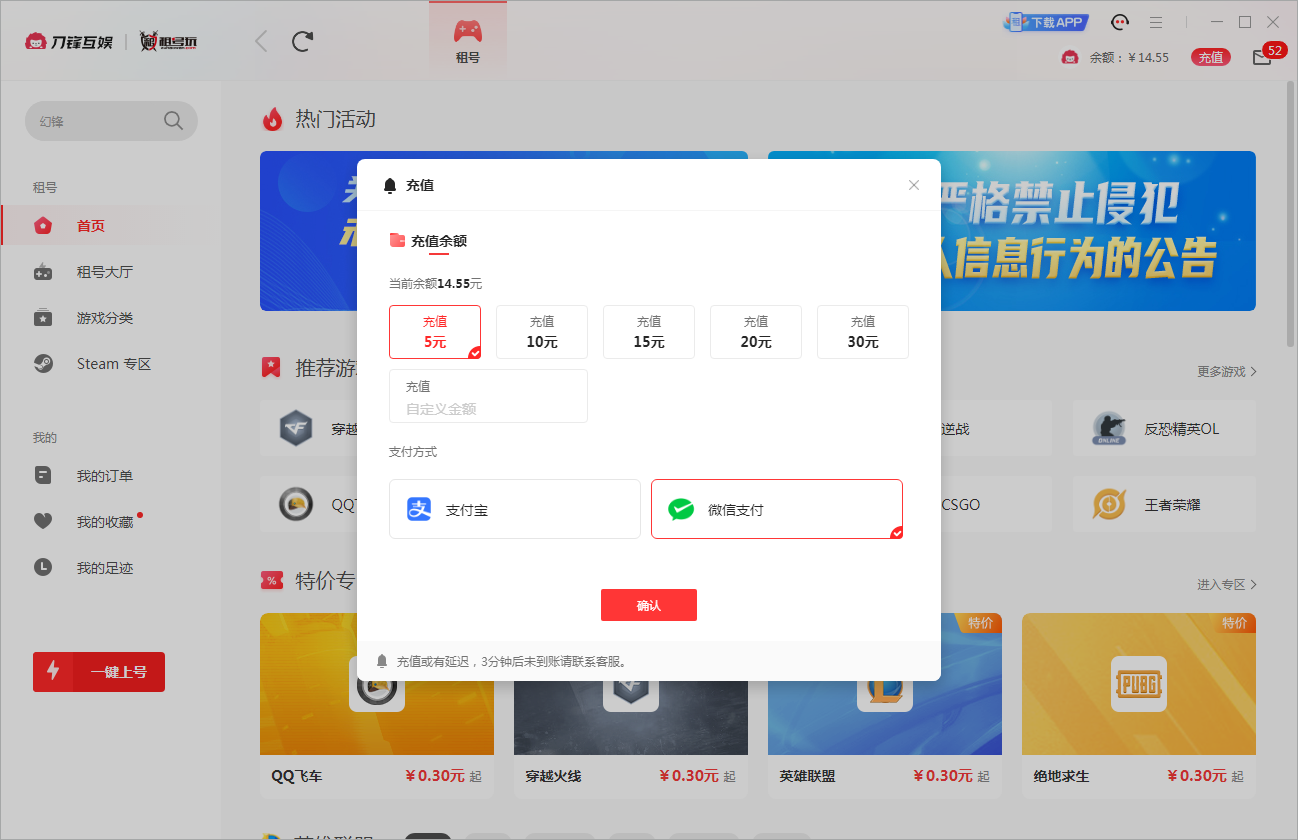 3.选择账号、租用自己心仪的账号,选择游戏,区服,输入段位搜索,或者输入其他想租的信息搜索